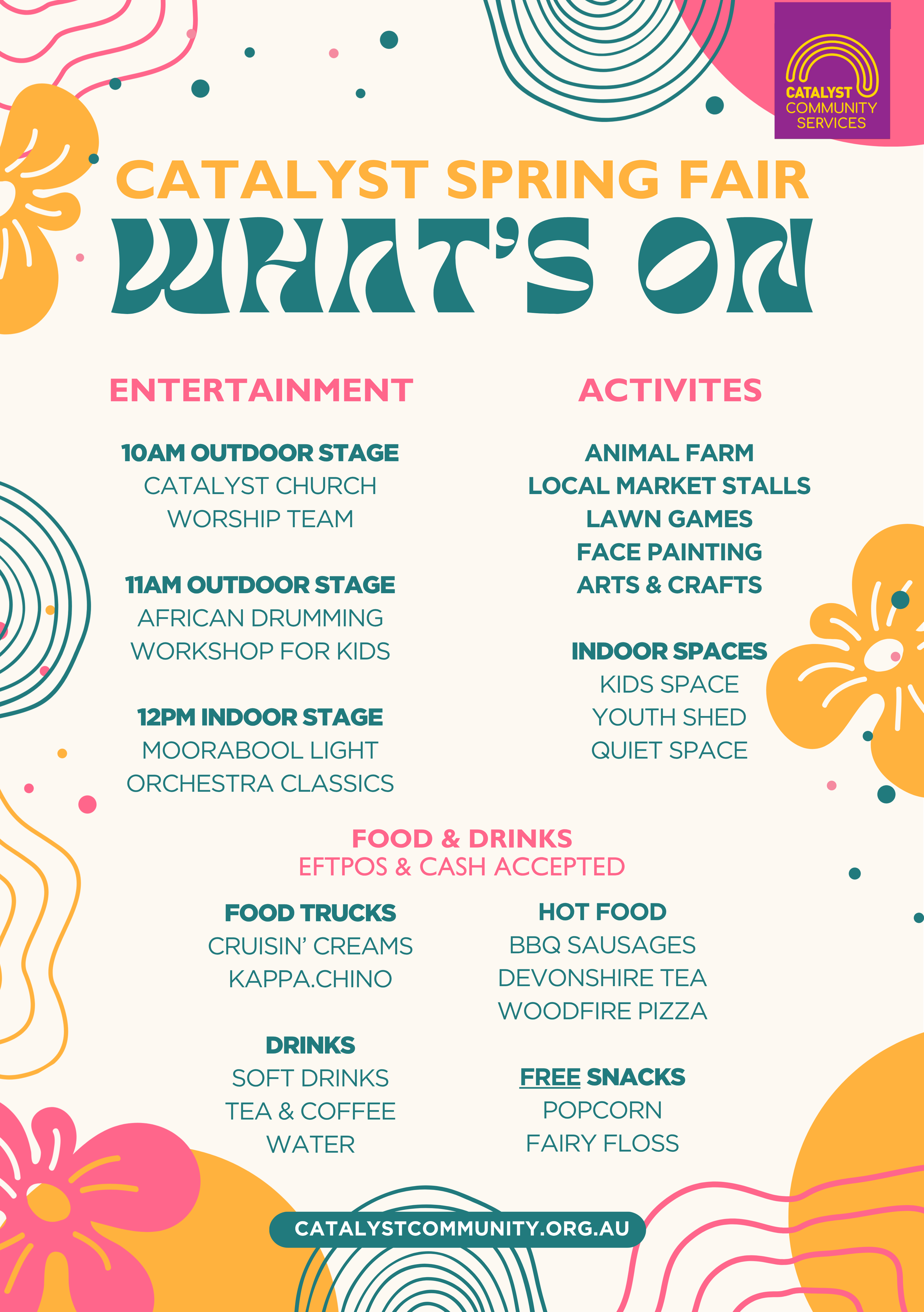 Catalyst Community Services is the outreach arm of Catalyst Baptist Church, partnering together to deliver local events like the Catalyst Spring Fair for local communities! Catalyst are excited to launch their new church campus in Bacchus Marsh in 2025, believing in building a loving community, seeking, serving and sharing Jesus!